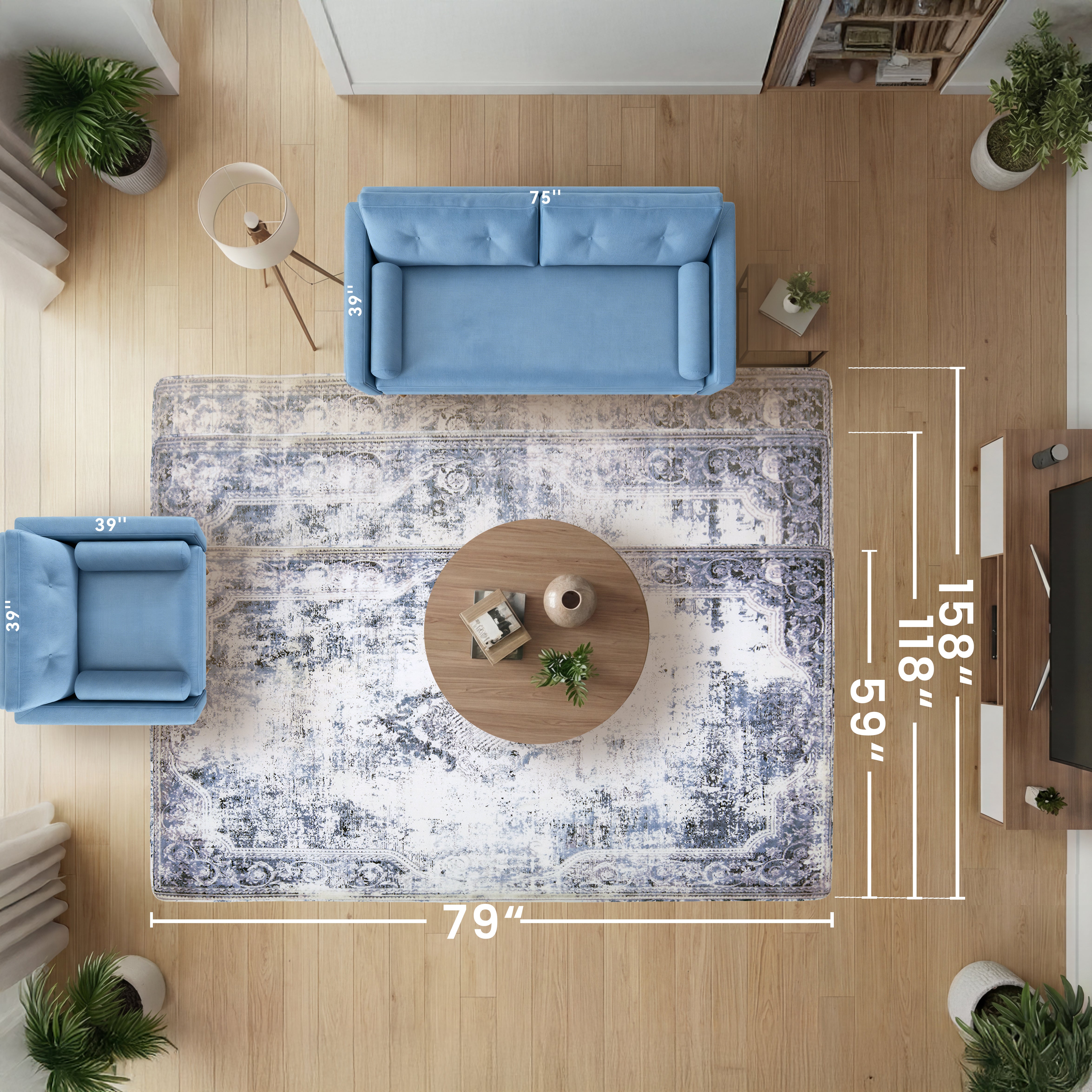 Grab your tape measure and write down the dimensions of your room. You may even like to sketch a room plan, to give you an idea of how much actual floor space you have that won’t be covered with other furniture. Check out our visual guide to choosing the right size mat below, or download it to print and keep while you're planning your space >>> learn more